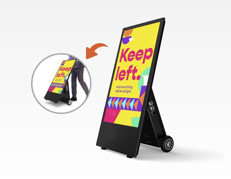 Erittäin kirkkaalla 43″ näytöllä varustettu akkukäyttöinen A-teline, joka soveltuu myös ulkokäyttöön.